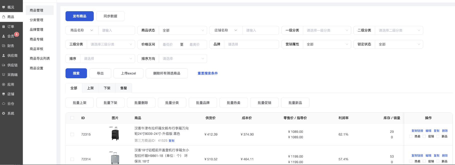 • 排序:支持选择ID、供货价、零售价、利润率进行排序,支持按从小到大或者从大到小排序;注意:只能根据搜索结果进行排序,不能全部商品直接使用排序!