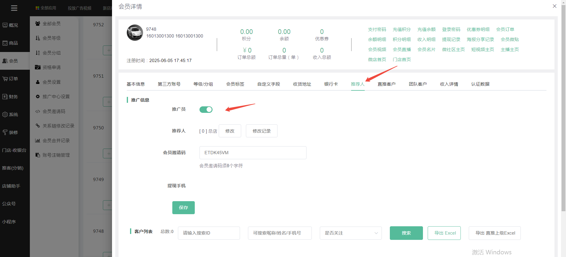 第八步,点击推荐人--开启推广员按钮--点击保存键