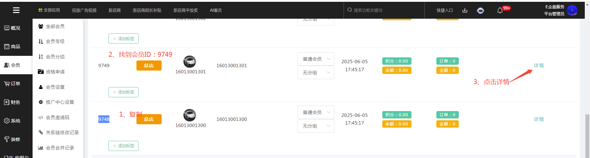 第九步,复制会员ID:9748的9748,找到会员ID:9749点击详情--找到推荐人--开启推广员,点击推荐人的修改按钮--填上一级的会员ID号--保存