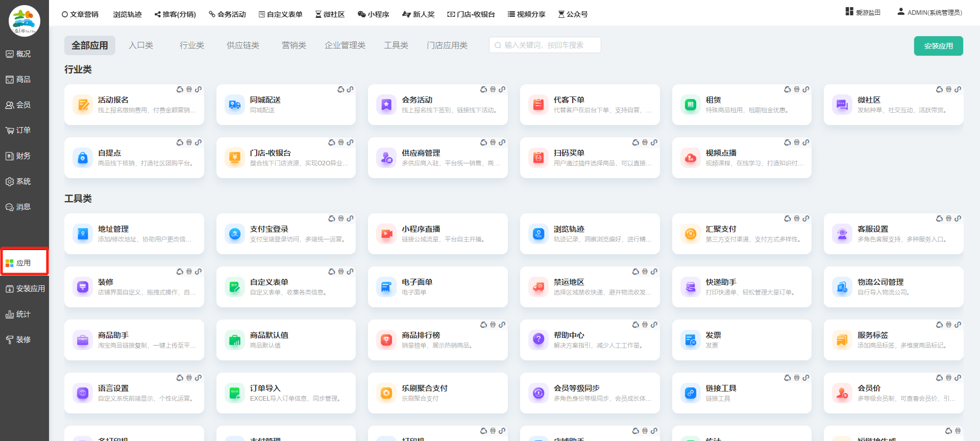 目录 搜索 展开 一、前期准备资料二、数字乡村码-上线操作指南1、服务号的申请流程及认证2、申请小程序流程3、开放平台绑定小程序和公众号三、数字乡村码-系统操作数字乡村码系统管理-概况数字乡村码-商品管理1、发布商品2、商品列表3、商品表单4、商品分类5、品牌管理6、配送模板7、评论管理8、优惠券管理9、商品标签10、退货地址设置11、满额优惠12、批量操作13、配送方式14、基础设置15、商品隐藏四、数字乡村码-会员管理1、全部会员2、会员等级3、会员分组4、资格申请5、会员设置6、推广中心设置7、会员邀请码8、会员关系链修改关系链修改记录9、会员合并记录10、账号注销管理11、会员设置中心五、数字乡村码-订单管理1、订单管理列表2、订单处理流程3、订单状态4、订单修改价格5、订单退款退货6、多包裹发货7、批量发货订单操作步骤8、催发货订单9、物流查询六、数字乡村码-财务管理1、余额设置2、会员余额3、充值记录4、转让记录5、余额明细6、收入明细7、提现设置8、提现统计9、积分管理10、转账审核11、收益广告12、批量充值七、数字乡村码-系统管理1、商城入口2、商城设置①、商城设置②、订单设置③、物流查询④、短信⑤、联系方式⑥、分类⑦、优惠券⑧、分享⑨、幻灯片⑩、广告位⑫、地图设置3、交易设置4、微信模板消息自定义消息模板(新版)自定义消息模板(旧版)小程序消息模板公众号模板消息变更公告5、语言设置6、权限管理7、多媒体管理八、数字乡村码-消息管理九、数字乡村码-应用管理十、数字乡村码系统-数据统计十一、数字乡村码-页面装修DIY1、模板管理2、店铺页面3、顶部导航4、底部导航5、DIY模板市场6、首屏广告7、基础设置8、装修DIY尺寸建议十二、供应商功能插件操作指南1、供应商2、门店-收银台门店申请和使用步骤门店管理①、门店-收银台 营销设置②、门店-收银台 分润设置门店分类门店申请门店审核门店商品门店商品订单收银台订单数据统计核销员基础设置默认设置门店装修3、微社区4、会务活动十三、营销插件操作指南活动报名提货卡新人奖微店问卷调查积分视频分享1、视频分享基础设置2、视频分享发现管理3、视频分享分类管理4、视频分享评论管理5、视频分享分红记录6、视频分享短视频中心每日红包幸运大抽奖签到优惠券二维码任务奖励优惠劵文章音频文章付费文章限时购新海报拓客卡操作流程积分活动素材中心视频红包十四、入驻门店应用类1、门店预约2、附近商品3、门店定位设置4、门店控制5、门店满额包邮6、门店满额减7、导入商品8、门店搜索9、门店股东10、核销券11、多门店核销1、商城后台设置2、前端功能演示十五、常见问题1、后台登录密码修改流程2、会员-余额,积分,后台如何进行充值与扣除3、如何修改上下级关系4、一种万能的获取商城小程序路径的方法 暂无相关搜索结果! 阅读次数:1753 本文档使用 模王系统 发布 九、数字乡村码-应用管理 九、商城管理-应用显示所有商城已安装并启用的应用,包含以下大类:具体根据自家商城后台系统显示为准。每个应用功能设置步骤较多,请查看相对应应用的学习文档。文档更新时间: 2024-01-08 10:36 作者:链上旅行