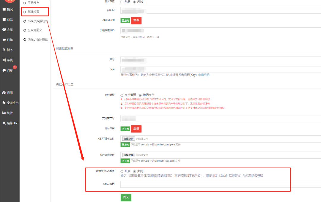 后台小程序设置路径:商城后台 -- 应用中心 -- 小程序 -- 基础设置,开启微信支付-V3新版